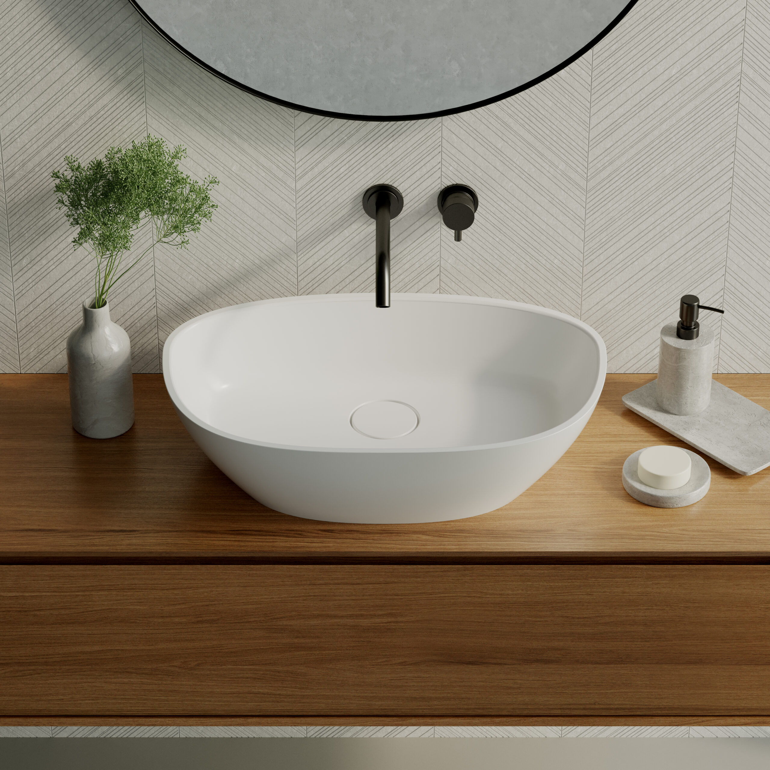 Un lavabo à poser de forme unique et caractéristique qui confère à chaque salle de bains un caractère individuel. La large vasque plate rend le lavabo très pratique à utiliser, car elle facilite l'accès et prévient des éclaboussures. Couvercle esthétique réalisé dans le même matériau que la vasque, subtilement associé au produit. Disponible en deux tailles pour s'adapter à une grande variété de salles de bains.